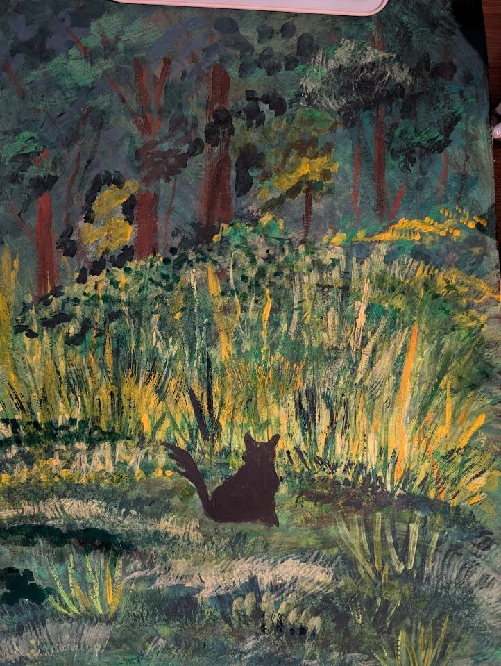 The cat’s silhouette functions as a steady presence amid the dynamic brushwork. Unlike my wider landscape compositions, this piece feels like a portrait of a precise moment: still, observant, textured. It reflects a close encounter with nature’s subtle rhythms rather than its grand vistas.