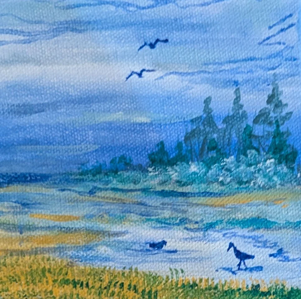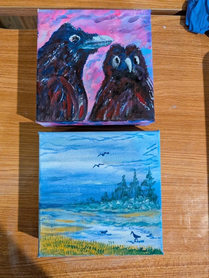 Ravens an Horizons 5” x 5” inch gallery canvas gouache paintings for the 2026 Art Dash.