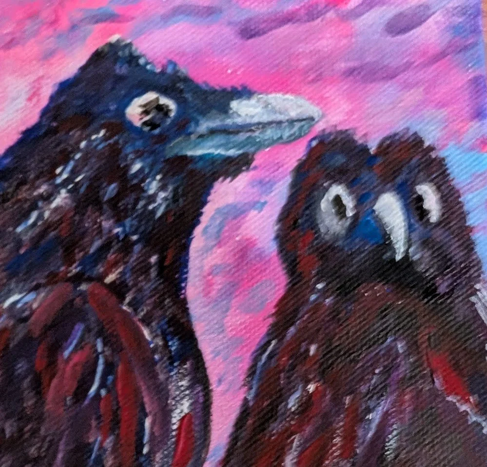 The Ravens: I wanted to capture the intelligence and "vocal" nature of these birds. Instead of a literal black, I leaned into my Fauvist and Impressionist influences, layering indigos, violets, and electric blues. By setting them against a vibrant, pulsing magenta sky, I hoped to create a sense of iridescence that feels alive.